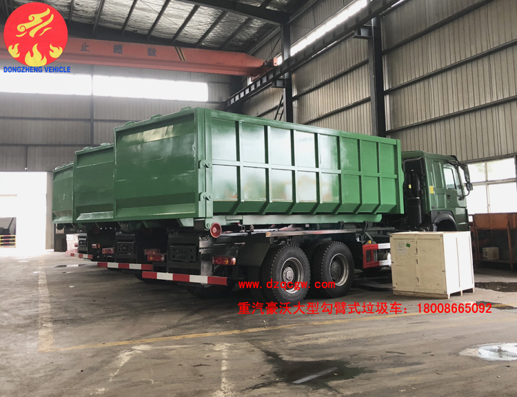 重汽豪沃后雙橋大型勾臂式垃圾車已下線,準備發(fā)往港口。